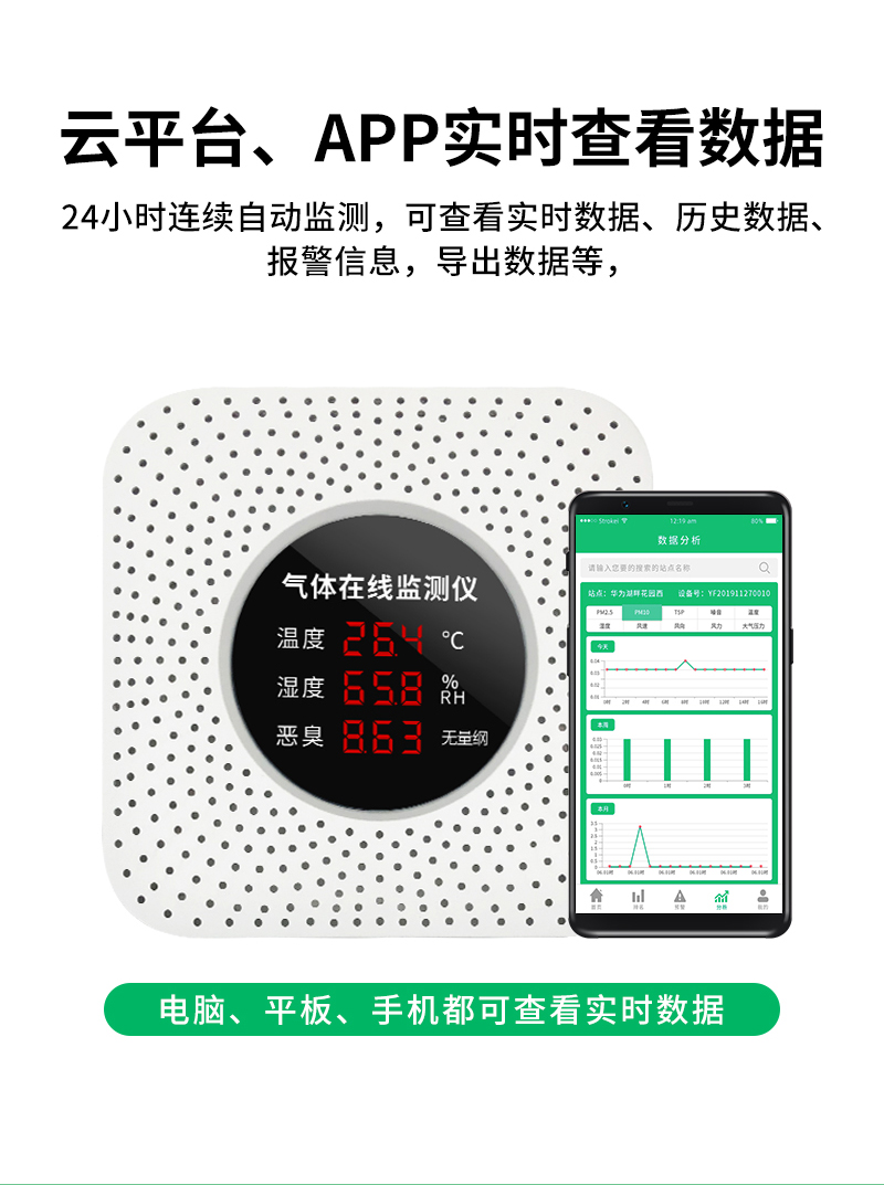 可在app和云平臺查看實時數據、歷史數據、導出數據等,同時具備24小時連續監測、超標報警、數據存儲功能