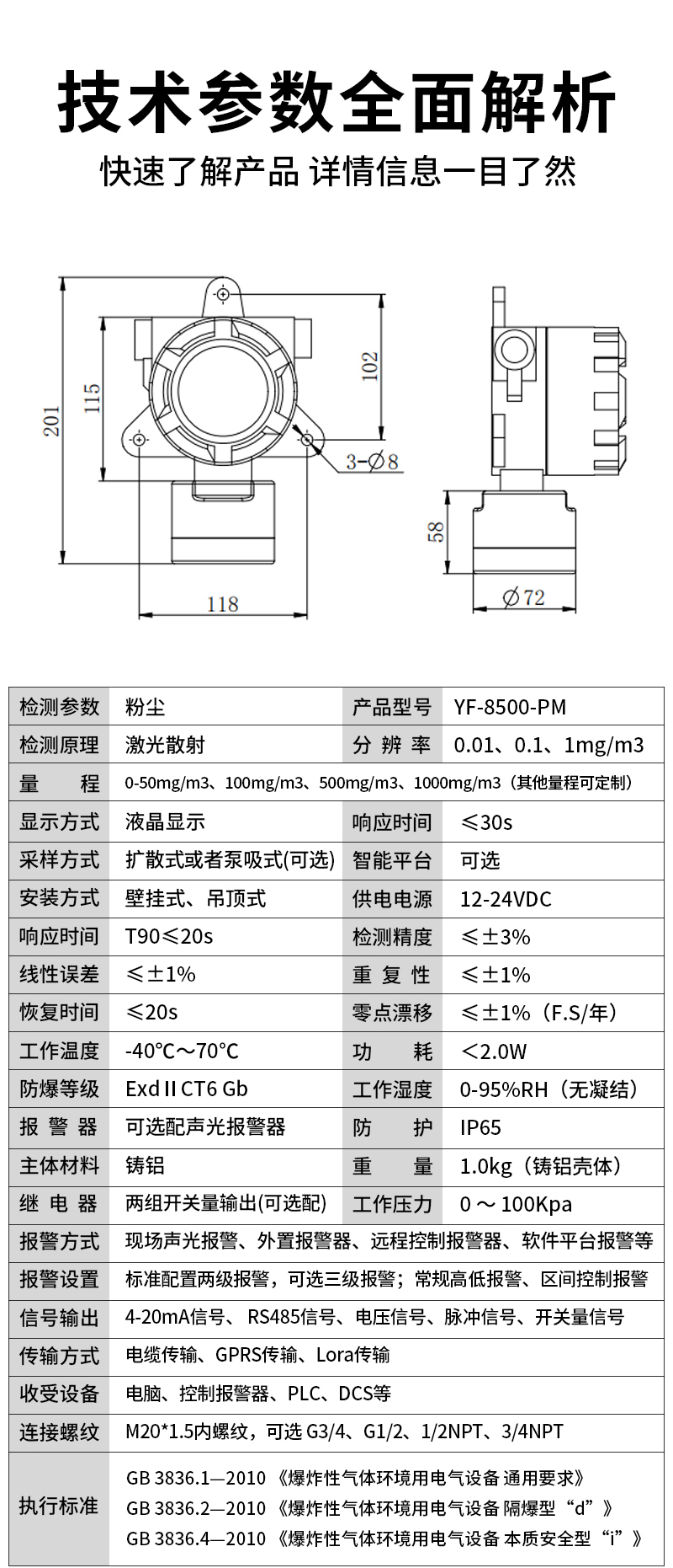 YF-8500-PM奕帆科技YF-8500-PM防爆粉塵濃度檢測儀,適用于工廠車間中的粉塵濃度實時準確檢測,采用進口激光傳感器和微控制器技術(shù),響應(yīng)速度快,測量精度高,穩(wěn)定性和重復(fù)性好等優(yōu)點。防爆接線方式活用于各種危險場所,并兼容種控制報警器,PLC,DCS等控制系統(tǒng),可以同時實現(xiàn)現(xiàn)場報警預(yù)警,4-20mA標準信號輸出,繼由器開關(guān)量輸出,易示各項技術(shù)指標和顯示濃度值,同時具有多種極的電路保護功能,有效防止各種人為因素,不可控因素導(dǎo)致的儀器損壞。